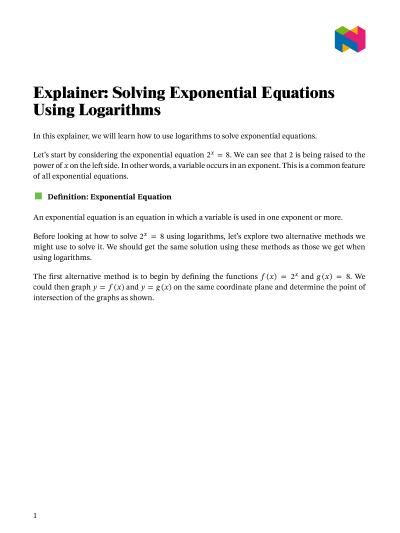 Aug 27, 2018 · again, there really isn't much to do here other than set the exponents equal since the base is the same in both exponentials. Finally, all we need to do is solve for x x. Ixl.com has been visited by 100k+ users in the past month May 11, 2018 · to move the exponents out of each of the logarithms. What are examples of exponential equations? Do not calculate the logs yet. We're here to support your family! We identify the exponent, latexx/latex, and the argument, latex2^{x}/latex, and rewrite the equivalent expression by multiplying the exponent times the logarithm of the argument, latex2/latex. Rewrite this equation so that it looks like the other ones we solved. Rewriting the exponential expression this way will allow you to simplify and solve the equation. How do you create an exponential equation? Apr 26, 2021 · log a r = r log a {\displaystyle {\text {log}}a^ {r}=r {\text {log}}a}. How do you solve an exponential equation using log?